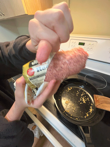 - Add flour and butter to the pork juice, stir contantly until medium brown